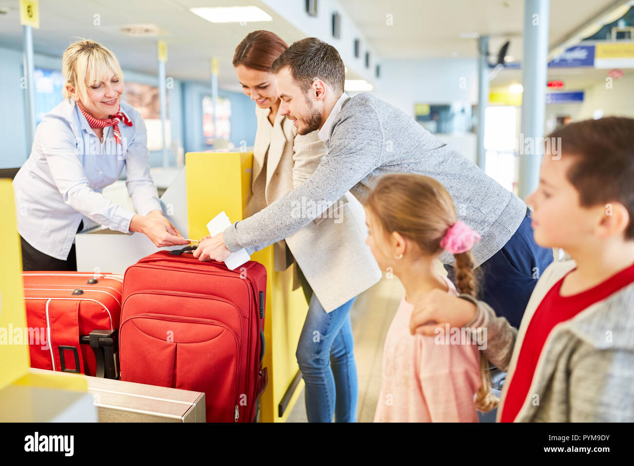 Agente de servicio en el mostrador de facturación de equipajes con la familia ayuda a la