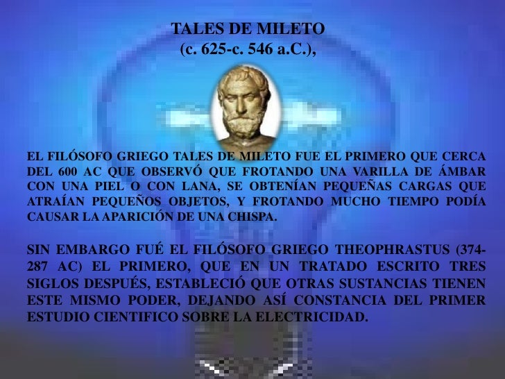 Tales de Mileto (624-543 a. C.) Fue un filosofo griego, fundador de la escuela jónica, considerado como uno de los siete sabios de Grecia. Desde el punto de vista de la electricidad, fue el primero en descubrir que si se frota un trozo de ámbar, este atrae objetos más livianos, y aunque no llego a definir que era debido a la distribución de cargas, si creía que la electricidad residía en.