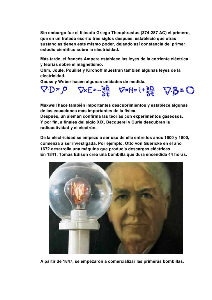 La electricidad ha existido siempre pertenece a la naturaleza, el hombre sólo la ha descubierto y la ha aprovechado. La electricidad natural se llama estática. Tales de Mileto fue el fundador de la Escuela Jónica de Filosofía y uno de los siete sabios de Grecia. Él descubrió que si frotaba una barra de ámbar (resina fosilizada) con un.