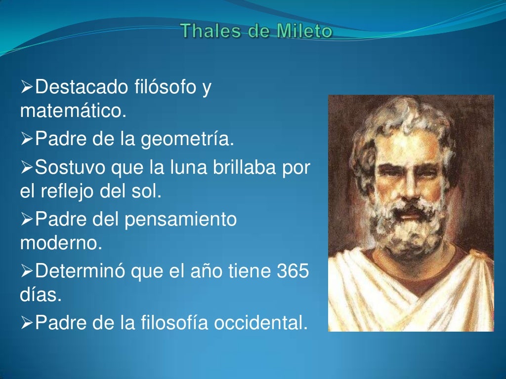 Tales de Mileto fue el padre de la filosofía y una figura prominente del estimado grupo de pensadores presocráticos, llamados los siete sabios . El método de Tales era único y eso sería repetido y perfeccionado por filósofos posteriores como Sócrates, Platón y Aristóteles. Varios avances en el pensamiento filosófico provienen de sus.