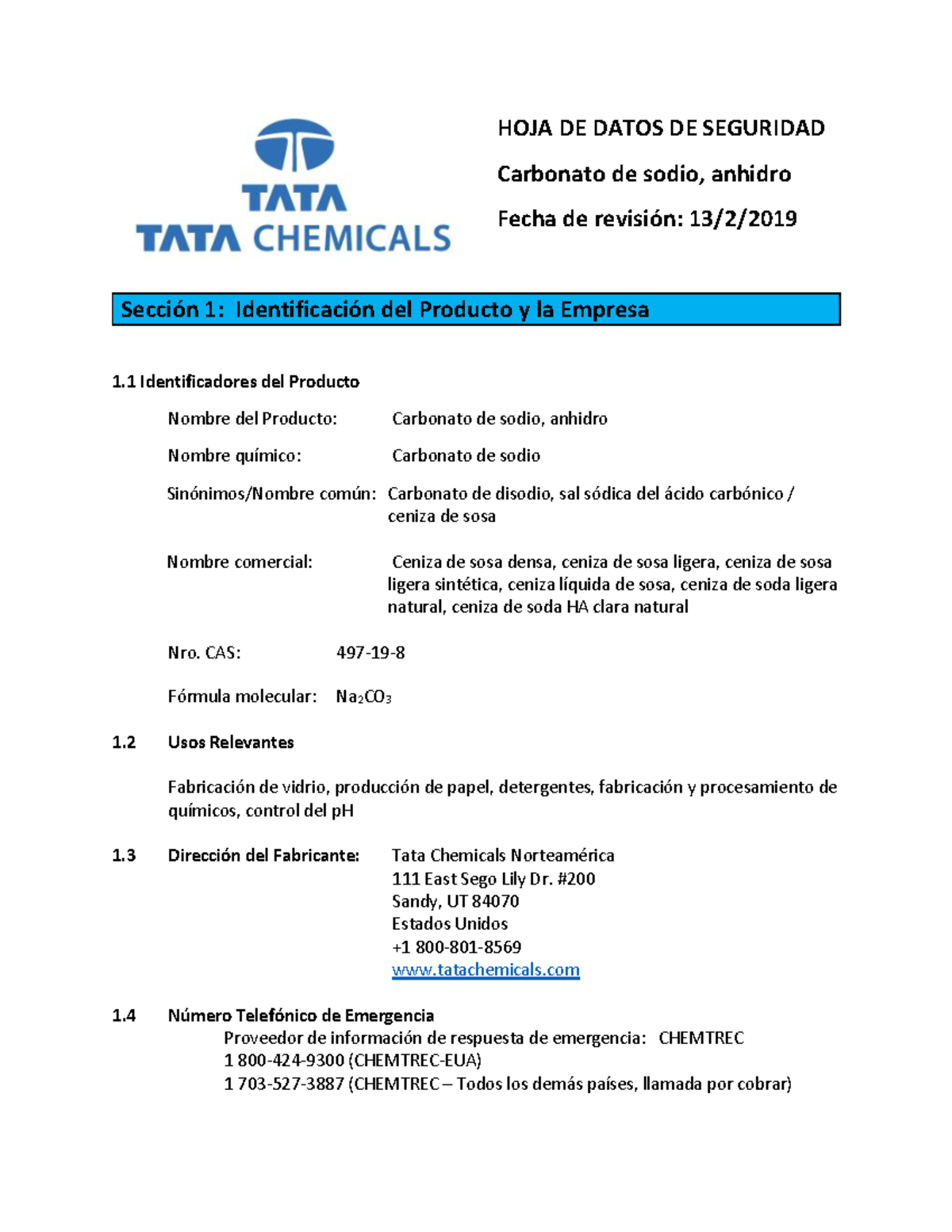 Tata msds sodium carbonate anhydrous es HOJA DE DATOS DE SEGURIDAD Carbonato de sodio, anhidro