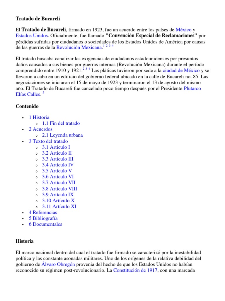 The Bucareli Treaty (Spanish: Tratado de Bucareli), officially the Convención Especial de Reclamaciones (Special Convention of Claims), was an agreement signed on August 13, 1923 between México and United States.It settled losses by US companies during the Mexican Revolution. It also dealt with the illegality of potential expropriating American landholding and subsoils for the sake of.