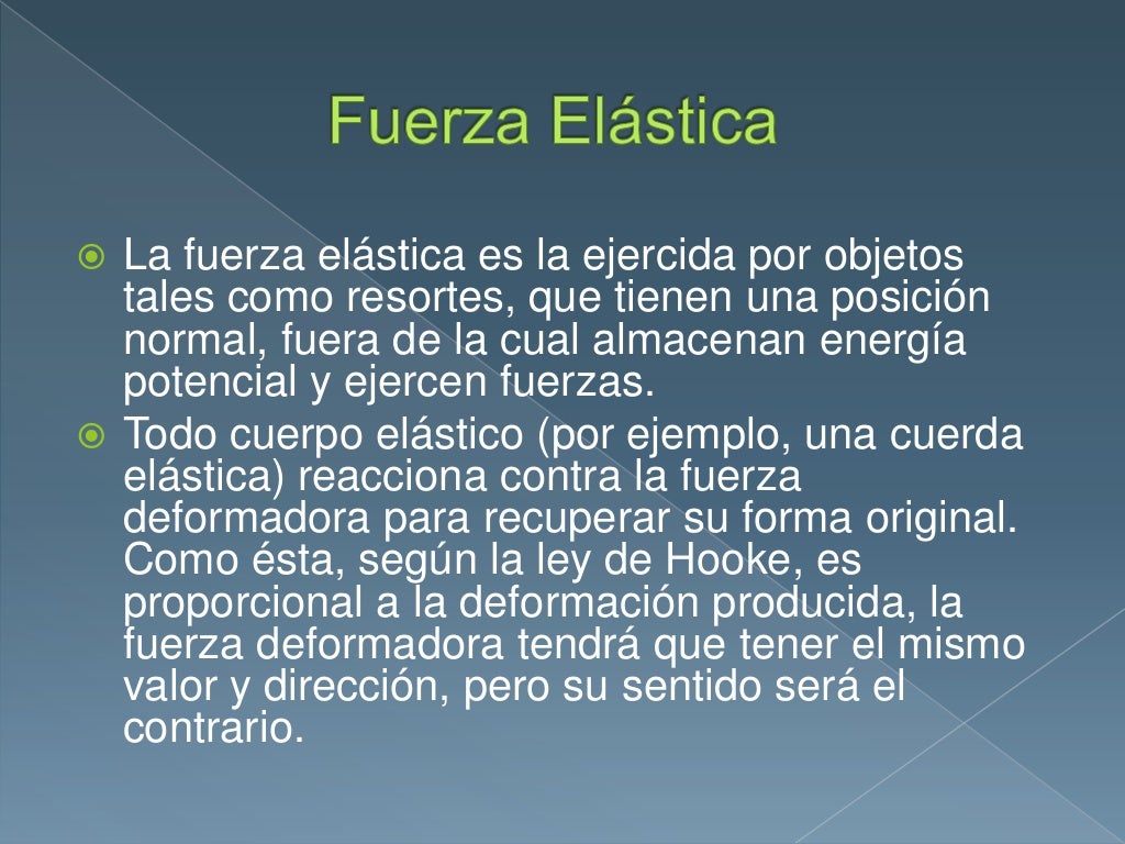 Fuerzas elásticas. Todo cuerpo elástico (por ejemplo, una cuerda elástica) reacciona contra la fuerza deformadora para recuperar su forma original. Como ésta, según la ley de Hooke, es proporcional a la deformación producida, la fuerza deformadora tendrá que tener el mismo valor y dirección, pero su sentido será el contrario. F=-k·x.