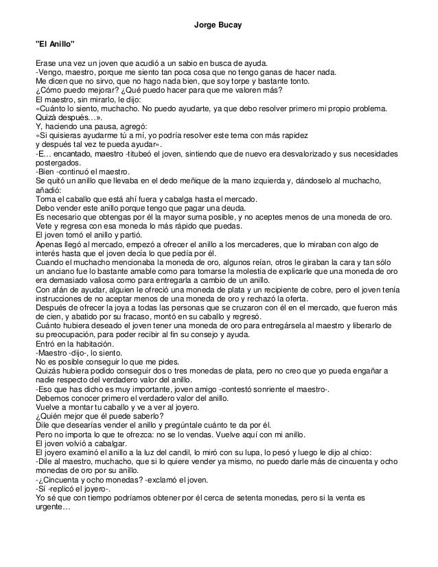 El verdadero valor del anillo: un cuento para trabajar la autoestima. Cuento del poeta argentino Jorge Bucay: Érase una vez un joven que acudió a un sabio en busca de ayuda. -Vengo, maestro, porque me siento tan poca cosa que no tengo ganas de hacer nada. Me dicen que no sirvo, que no hago nada bien, que soy torpe y bastante tonto.