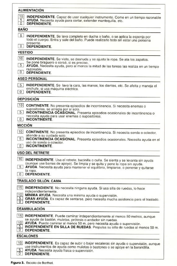Valoración: Se trata de un instrumento para evaluar la independencia de un enfermo en cuanto a la realización de las actividades básicas de la vida diaria. En muchos casos, puede ser contestado por el propio enfermo, en otros deben ser los familiares, y en todo caso, deberá mediar una exploración adecuada.