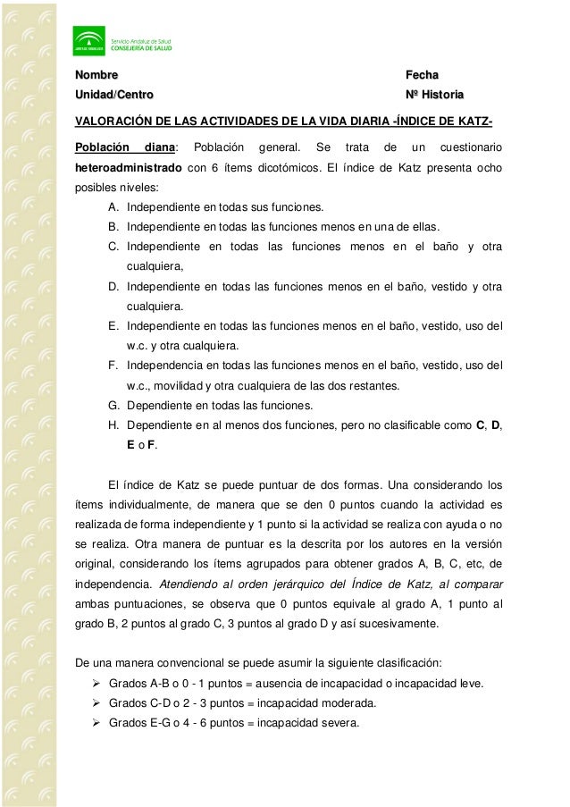 Índice de Katz de independencia en las Actividades de la vida diaria (AVD) Índice de Katz de independencia en las Actividades de la vida diaria (AVD) Importante: Independiente significa sin supervisión, dirección o ayuda personal activa, con las excepciones que se indican más abajo. Se basan en el estado actual y no en la capacidad de.
