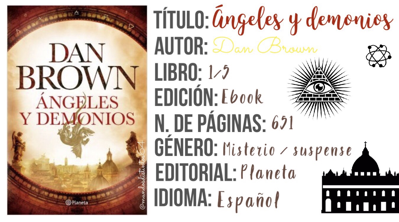 Ángeles y demonios es una novela de intriga y suspenso, escrita por Dan Brown y publicada en 2000. El profesor de simbología religiosa Robert Langdon, se ve pronto sumido en la búsqueda de secretos de una antigua secta denominada Illuminati y por la búsqueda del arma más mortífera de la humanidad (antimateria) que estos han puesto en la Ciudad del Vaticano con el fin de destruir la.