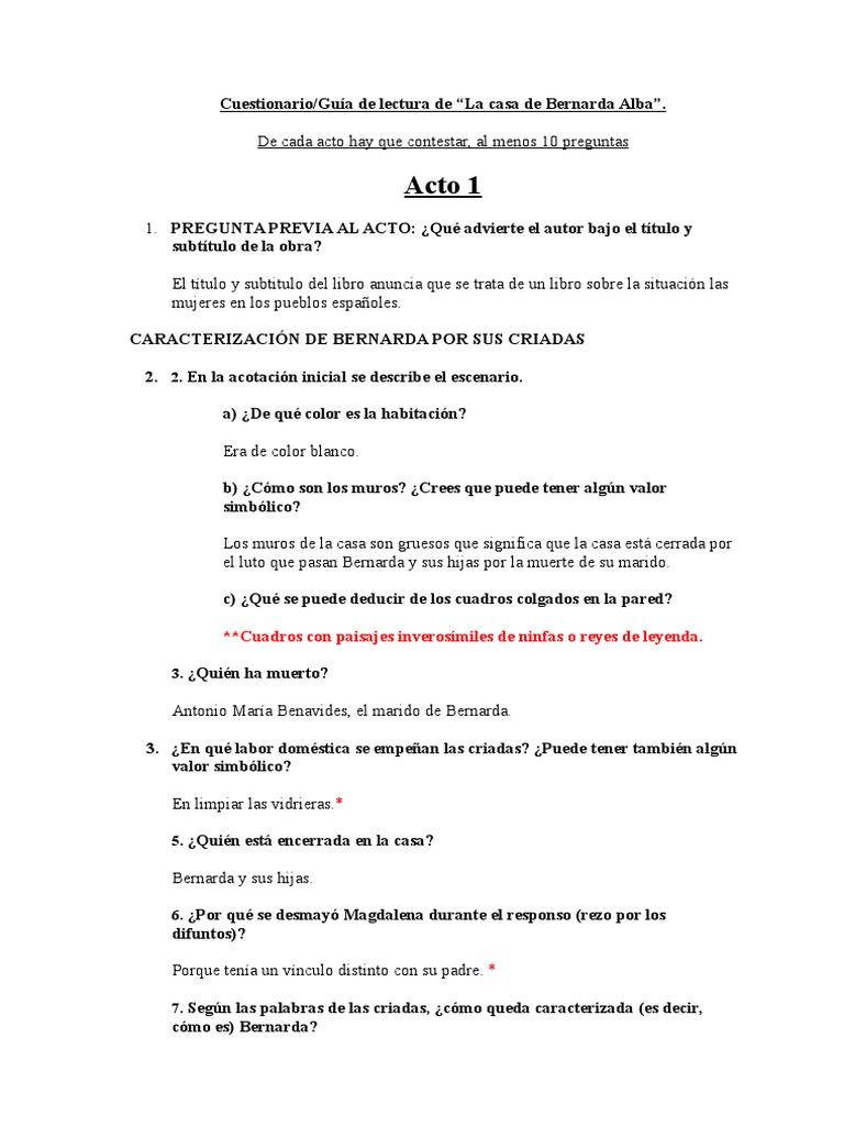 La casa de Bernarda Alba FICHA DE LECTURA. Anuncio. La casa de Bernarda Alba. ACTO PRIMERO. Coméntense, ante todo, el subtítulo, la advertencia que sigue al reparto y la acotación inicial. 1. [Desde el comienzo hasta «Sale riendo».] a) Obsérvese cómo se nos va informando de la situación y.