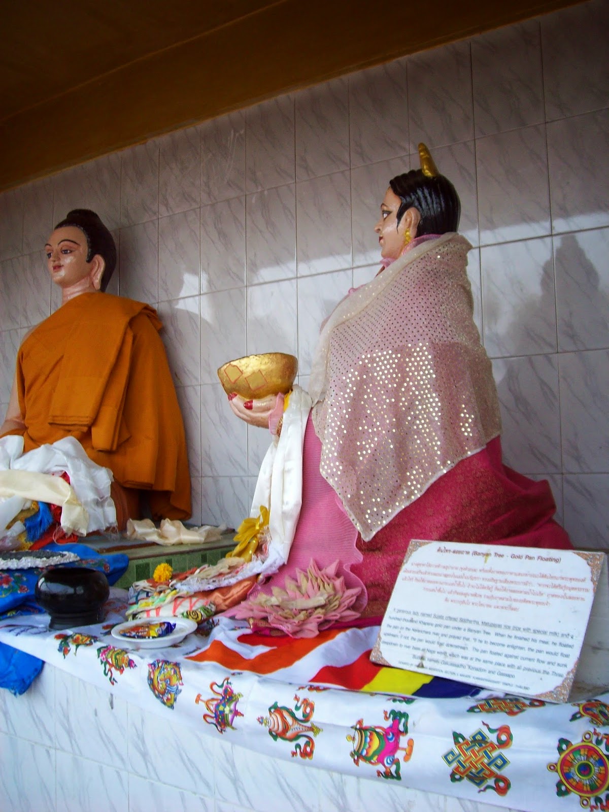 Ojos de Buda: representan la omnisciencia y la compasión de Buda. Árbol bodhi: simboliza el evento clave de la iluminación de Buda que ocurrió debajo de este árbol. Rueda del dharma: figura el ciclo de enseñanzas de Buda y la naturaleza cíclica de la existencia. Sus ocho puntas simbolizan el noble óctuple sendero.