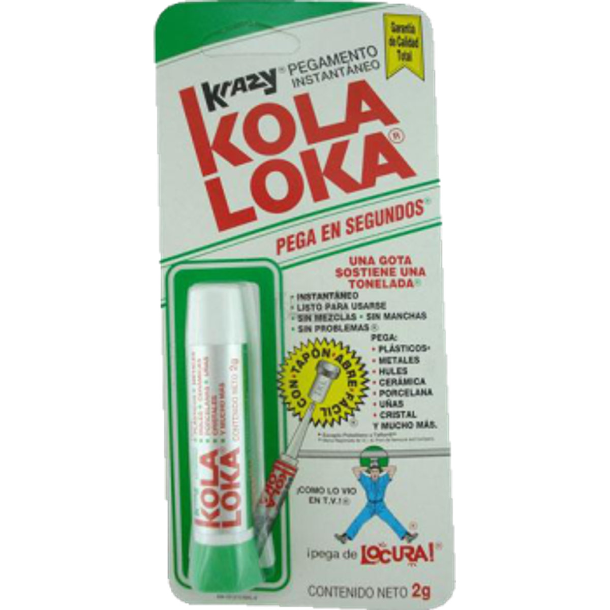 Pegamento instantáneo de 2 gr Kola Loka, apto para hacer reparaciones en plástico, metal, hule, cerámica, porcelana, uñas, cristal, entre otros materiales, excepto objetos que contengan fluoruro de carbono, acero inoxidable, polietileno o teflón. Su fórmula no se requiere mezclar con otros ingredientes para usarse, no deja manchas.