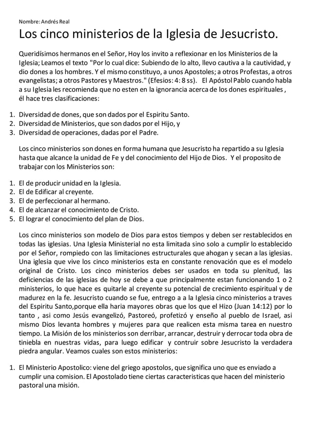 En definitiva, la Biblia enfatiza en la importancia de estos cinco ministerios para edificar y fortalecer la iglesia de Cristo, y para capacitar a los creyentes a llevar a cabo la obra del ministerio según la voluntad de Dios. Explora los 5 ministerios según la Biblia y sorpréndete con su poder divino. 1. Apostolado. 2. Profecía. 3.