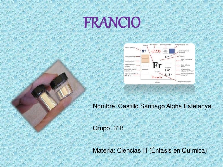 Francio. iso. (0 °C y 1 atm), salvo que se indique lo contrario. de enlace covalente, metálico o iónico. El francio, antiguamente conocido como eka-cesio y actinio K, [ 1] es un elemento químico cuyo símbolo es Fr y su número atómico es 87. Su electronegatividad es la más baja conocida y es el segundo elemento menos abundante en la.