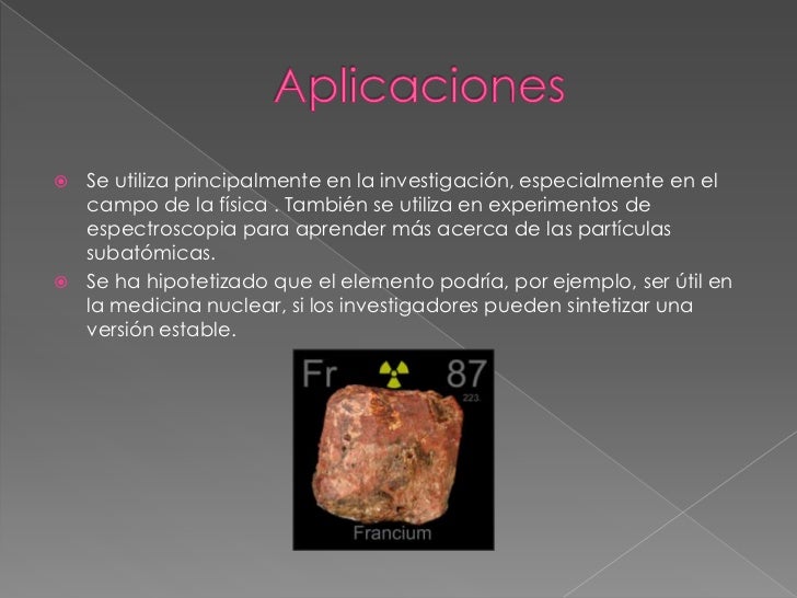 El francio es un elemento químico radioactivo con el símbolo «Fr» y número atómico 87. Es un metal alcalino, extremadamente raro y con una vida media muy corta, lo que significa que se descompone rápidamente. 2. Usos del Francio en la actualidad. Se utiliza principalmente en la investigación científica.