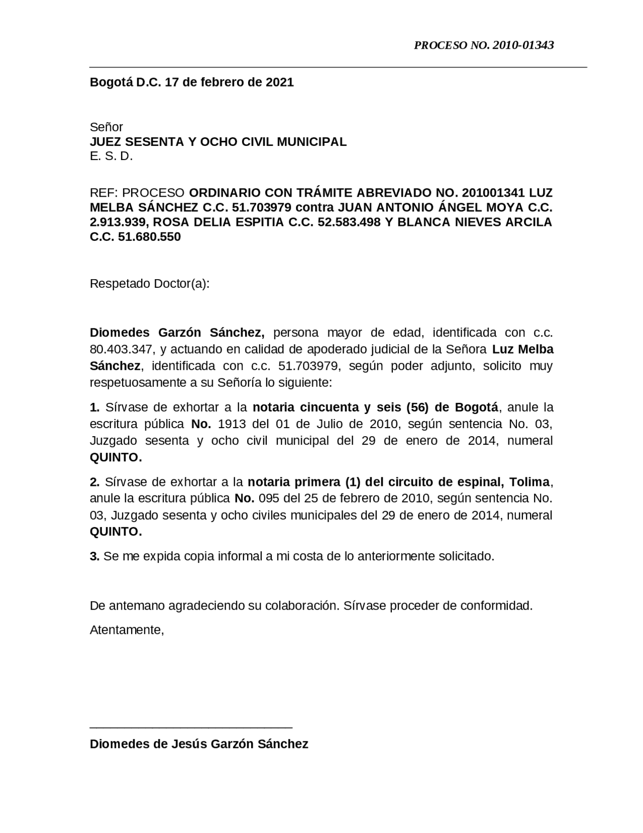 Solicitud DE Exhorto Resumen EXPEDIENTE 011(6)01 SE SOLICITA QUE SE LIBRE EXHORTO AL