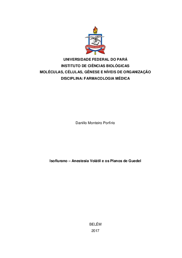 Bengü Köksal. UNIVERSIDADE FEDERAL DO PARÁ INSTITUTO DE CIÊNCIAS BIOLÓGICAS MOLÉCULAS, CÉLULAS, GÊNESE E NÍVEIS DE ORGANIZAÇÃO DISCIPLINA: FARMACOLOGIA MÉDICA Danillo Monteiro Porfírio Isoflurano - Anestesia Volátil e os Planos de Guedel BELÉM 2017 f2 Danillo Monteiro Porfírio 201709740106 Turma A/2017 Isoflurano - Anestesia.