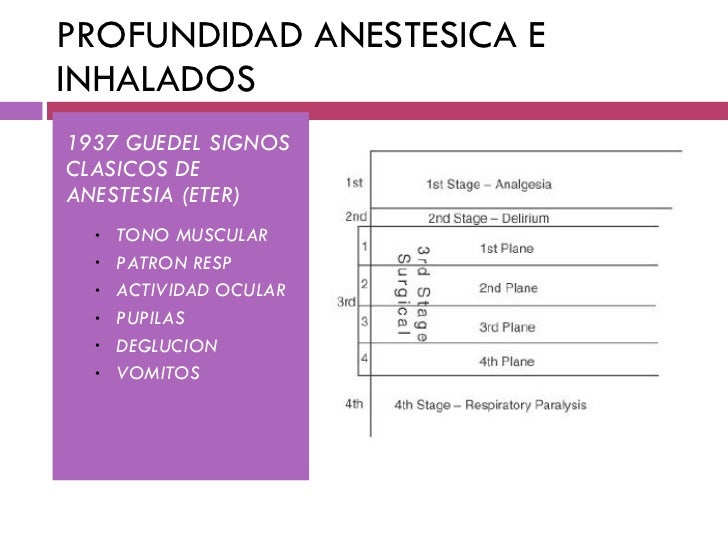 Respuesta ventilatoria. De esta forma, se definen 4 etapas, desde la más superficial (etapa 1) a la sobredosificación anestésica (etapa 4), siendo la etapa 2 la que se relaciona con excitación y delirio y la 3 la típicamente quirúrgica. La tercera etapa, se divide a su vez en 4 planos. Estos 4 planos se definen principalmente en función.