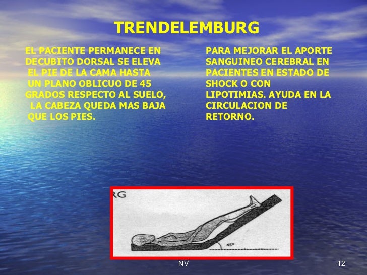Posición de Trendelenburg. En la ciencia de la medicina, la posición de Trendelenburg es aquella en que se coloca al paciente en decúbito supino y con la cabeza más baja que los pies, de tal forma que se favorece por efecto de la gravedad el retorno de la sangre venosa hacia el corazón a través de la vena cava inferior. 1 2 .