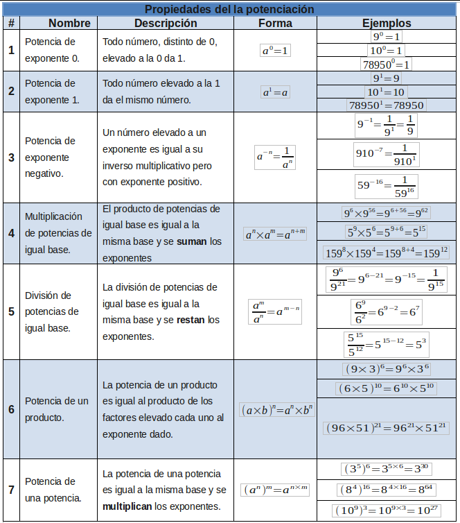 Las Propiedades de la Potenciación explicadas de manera detallada con ejemplos y analizando sus reglas a partir de sus deducciones.. Números Reales. Números Enteros; Números Decimales; Radicación; Fracciones; potenciación;. ¿Qué es la radicación? 22 comments Adriana Estefany Pérez dice: 9 marzo, 2019 a las 8:15 pm.