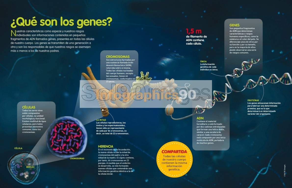 Un gen se refiere tradicionalmente a la unidad de ADN que lleva las instrucciones para elaborar una proteína específica o un grupo específico de proteínas. Cada uno de los estimados 20,000 a 25,000 genes en el genoma humano codifica un promedio de tres proteínas. Encontrados en 23 pares de cromosomas empacados en el núcleo de una célula.