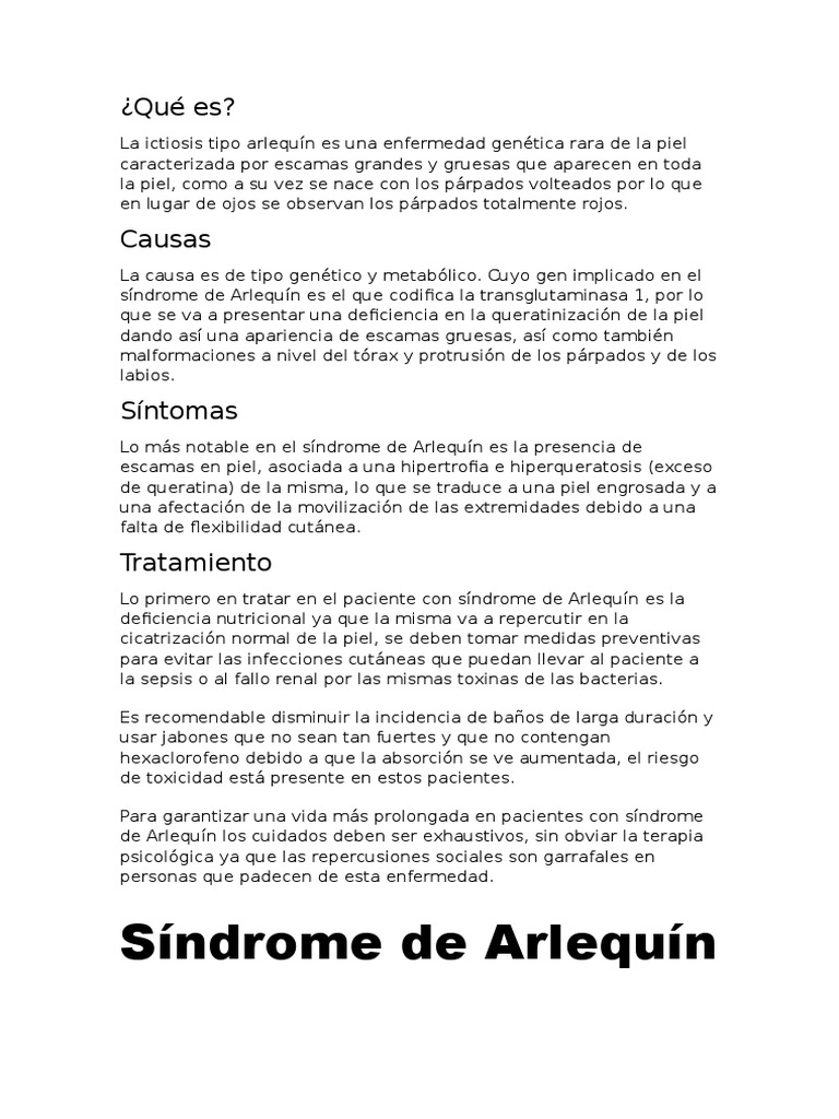 Se conoce como el síndrome de arlequín a una enfermedad de la piel. Ella es sumamente rara y es hereditaria y con algunos trastornos metabólicos. Una dermatosis congénita bastante grave. Es evidente a simple vista y se puede determinar desde el momento del nacimiento de la persona. Se le dio este nombre porque pareciera que la persona.