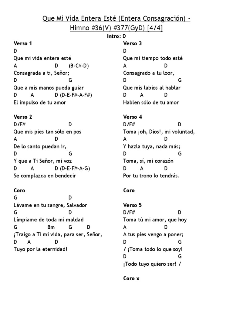 Crear y obtén +5 IQ. courier. "QUE MI VIDA ENTERA ESTE" ACORDES: C G F C Que mi vida entera esté G C Consagrada a ti, Señor F Que a mis manos pueda guiar C G C El impulso de tu amor CORO: F C Lávame en tu sangre, salvador, F C Limpiame de toda mi maldad F C Traigo a ti mi vida para ser, ser Señor G C Tuya por la eternidad ESPERO QUE LES.