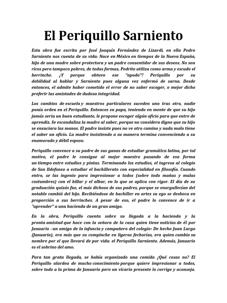 Resumen del libro El Periquillo Sarniento. Esta obra, redactada por el mexicano José Joaquín Fernández de Lizardi, cuenta la vida de Pedro Sarmiento. En sus líneas, el creador cuenta las aventuras de este pícaro, quien en su afán de ganarse la vida de modo simple, va superando las adversidades del destino hasta conseguir un enorme estudio.