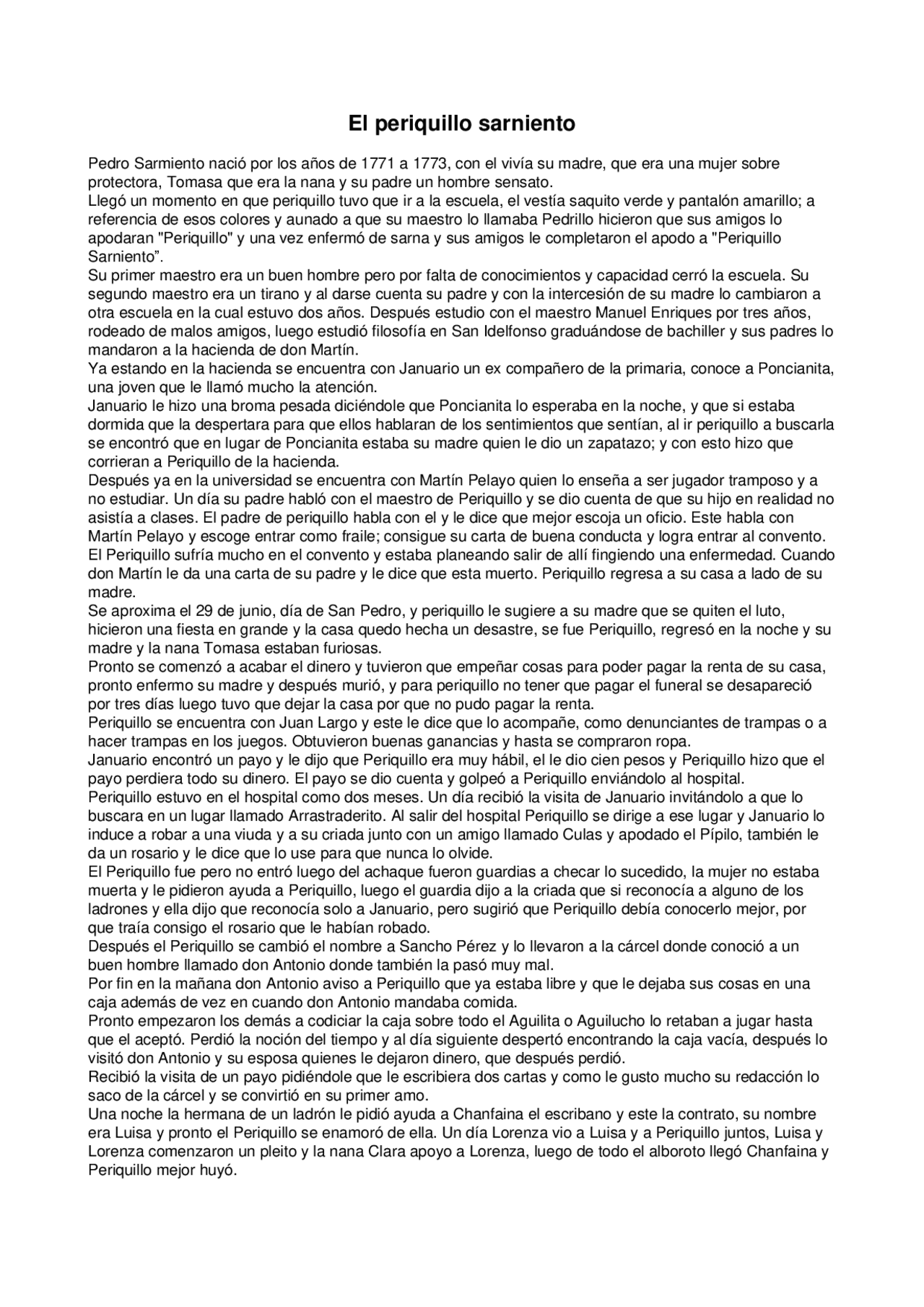 Resumen (El Periquillo Sarniento) Todo comienza en una habitación, en ella un hombre llamado Pedro Sarmiento enfermo y resignado a morir, nos comienza a escribir los sucesos de su vida, con la intención de advertirle a sus hijos, los peligros que amenazan a los hombres en el curso de sus días.