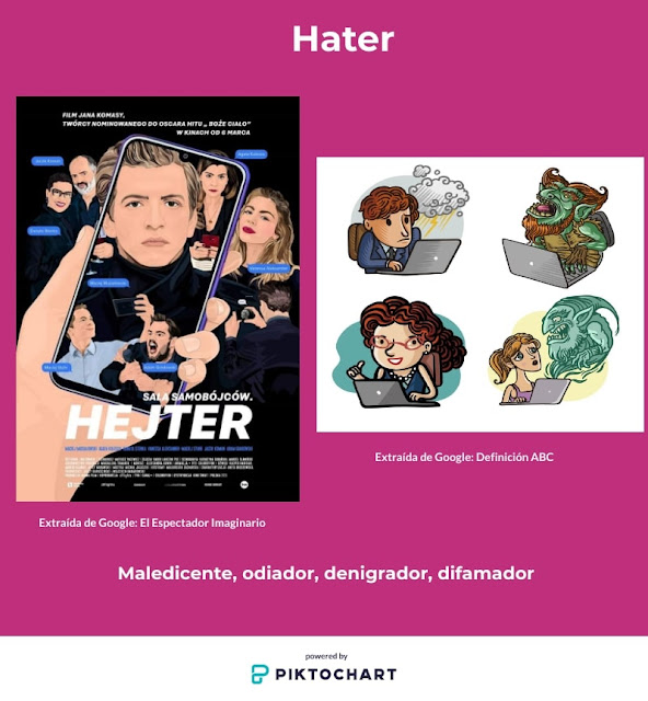 Los hater/s vendría a ser, traducido al español como odiador/eso persona que odia o aborrece. Son personas, que de una forma sistemáticamente actitudes negativas u hostiles ante cualquier asunto. Lo hacen a través de la burla, la ironía y el humor negro. El término hater ha adquirido una mayor popularidad con internet y las redes sociales.