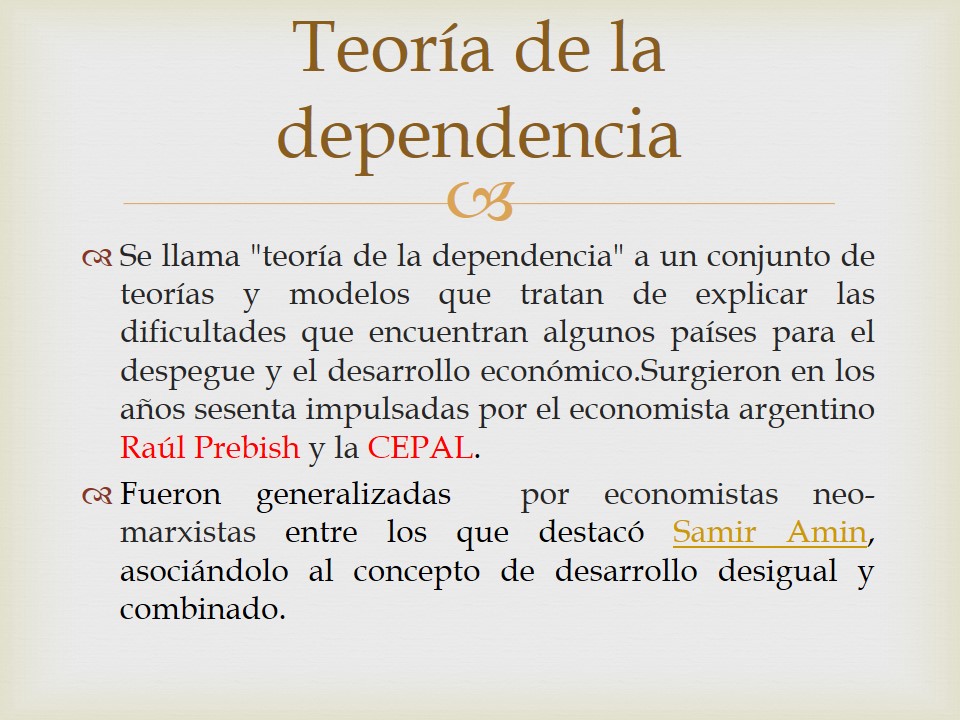 Teoría de la Dependencia. Las bases de la teoría de la dependencia surgieron en 1950 como resultado, entre otros, de las investigaciones de la Comisión Económica para América Latina y el Caribe (CEPAL). Uno de los autores más representativos fue Raúl Prebish. El punto principal del modelo Prebisch es que para crear condiciones de.