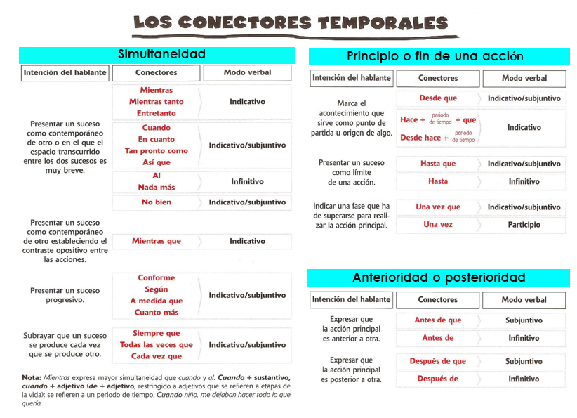 Tipos y lista de conectores temporales. En total se pueden identificar cuatro tipos de conectores temporales, que a continuación se explicarán de manera detallada. Conectores de tiempo. Se reconocen porque en el texto o la persona que lo emplea desea enfatizar la ocasión exacta del día durante el cual se desarrolla el hecho, circunstancia o.