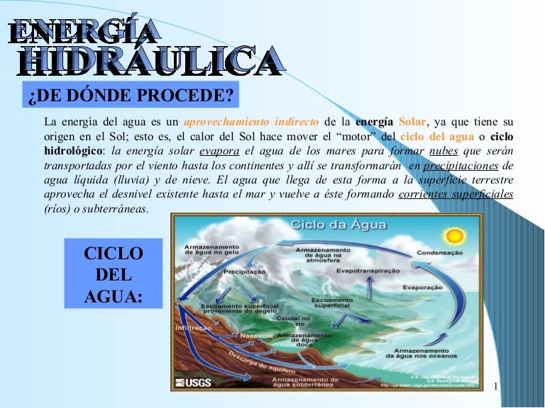 Energía hidráulica. Qué es: Es la energía renovable que aprovecha la energía cinética y potencial que poseen las corrientes o saltos de agua. Cómo se obtiene: El Sol provoca la evaporación del agua, que asciende a la atmósfera para luego caer en forma de lluvia y alimentar el caudal de los ríos (ciclo hidrológico).