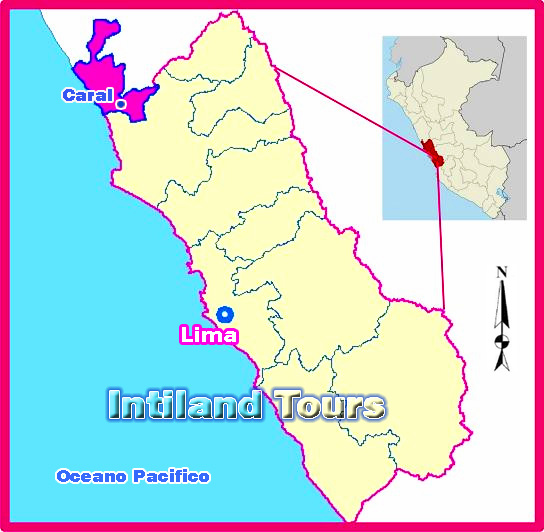 UBICACIÓN Geográfica La Ciudad Sagrada de CARAL se ubica al centro-norte del litoral peruano, bañado por el Océano Pacífico, distante a 182 km. al Norte de la ciudad de Lima, capital peruana, y a 23 km. al Este de la costa con una altitud geográfica de 350 msnm. (figura 1).