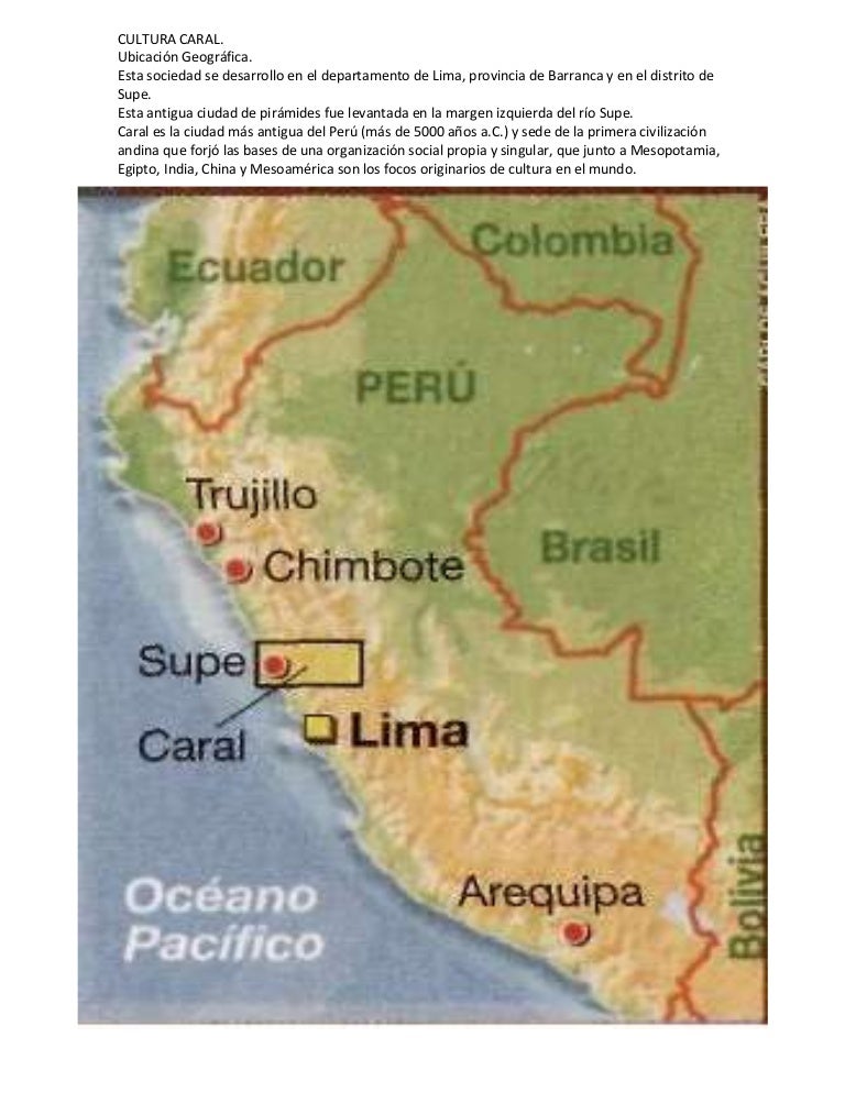 Ubicación Bienvenidos a Caral, Perú. Se halla situado en el distrito de Supe de la provincia de Barranca del departamento de Lima, a 184 km al norte de Lima Metropolitana, y a 23 km de la costa del Océano Pacífico, en un espacio geográfico conocido como el Norte Chico.Para llegar al sitio arqueológico se debe tomar un desvío a la altura del km 184 de la Panamericana Norte, vía que se.